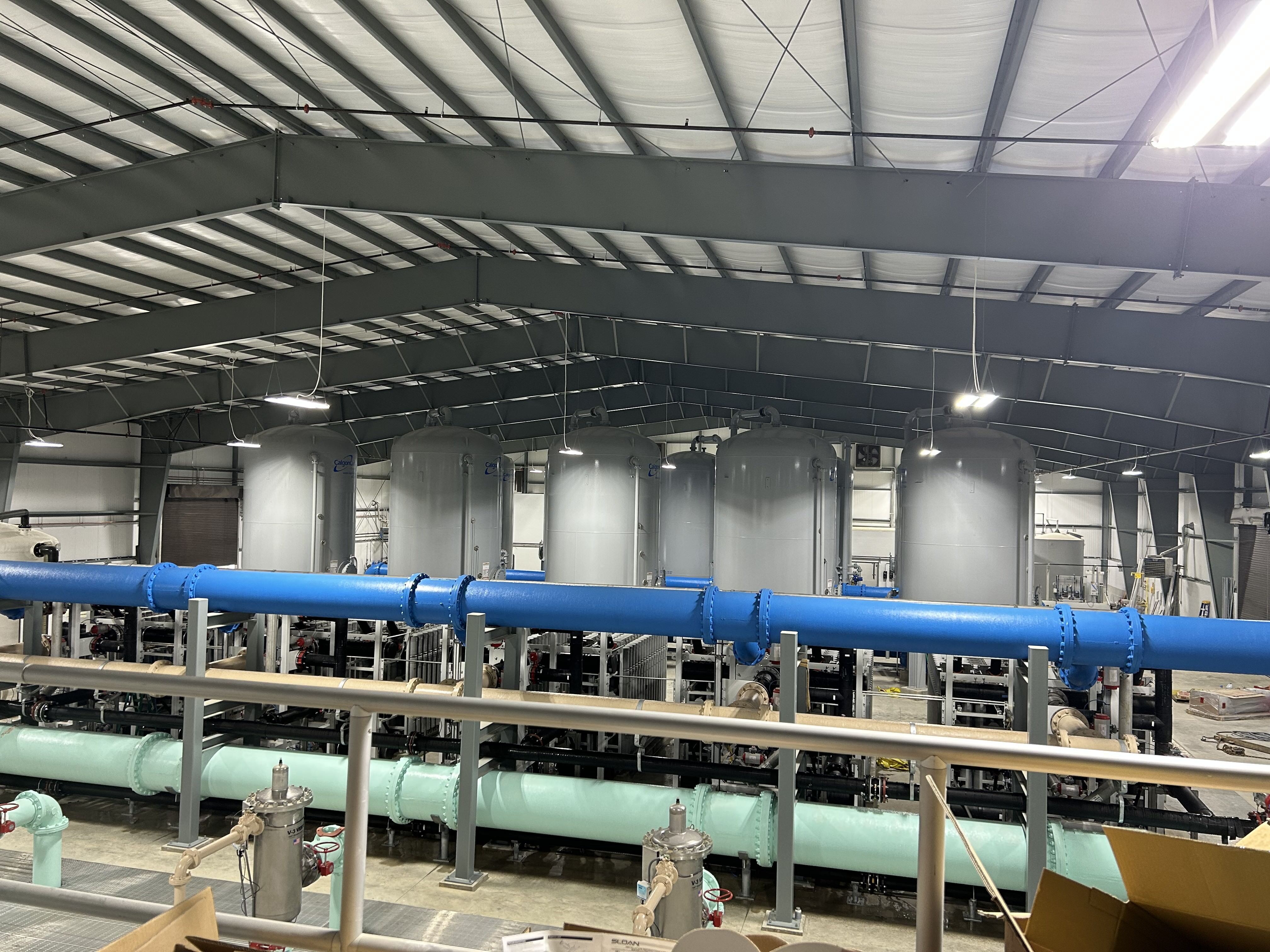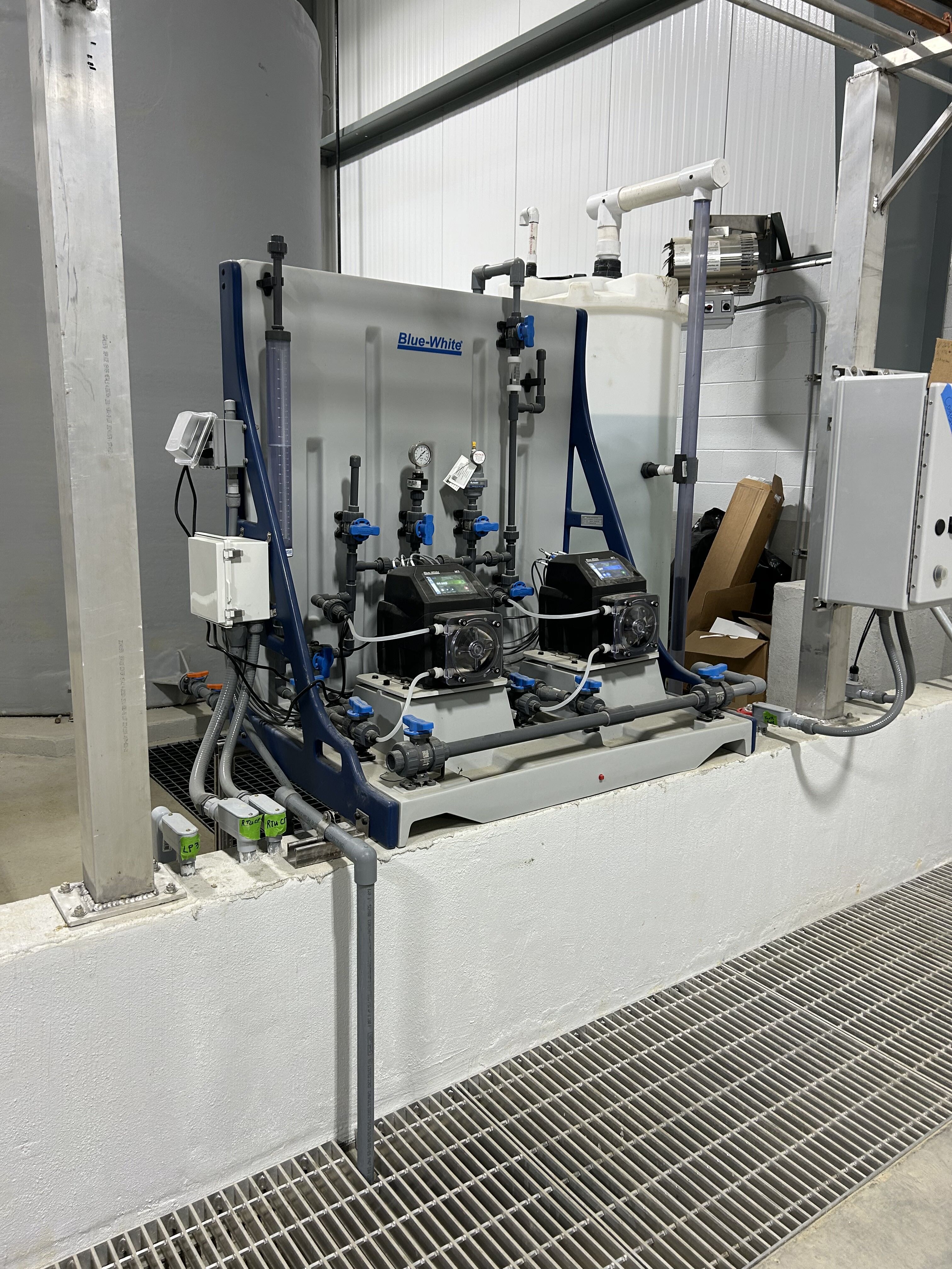 Blue White Metering Pump Skids, CleanWater1’s MicroClor System, Calgon Carbon 12-40 Vessels with F400 Media.